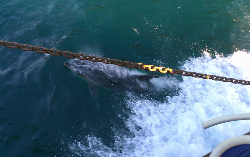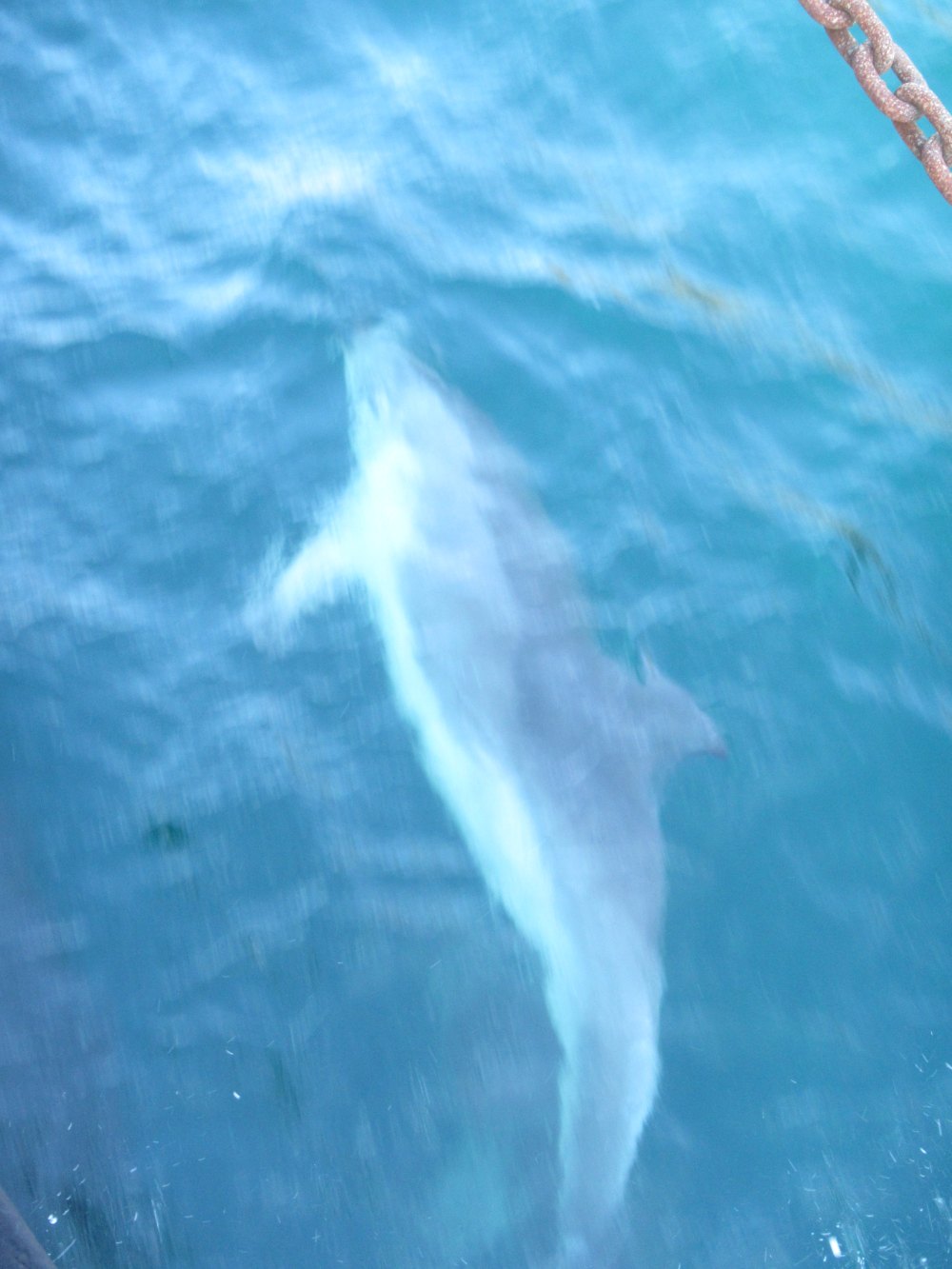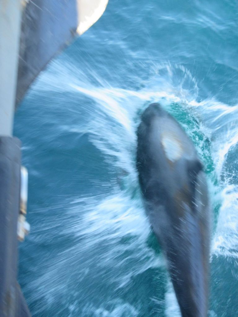 They were starting to serve dinner at 7.10pm, when we had notification that a pod of dolphins had decided to join us. Naturally, dinner, no matter how tasty, was going to take second fiddle to this, so we all crowded the bow instead.