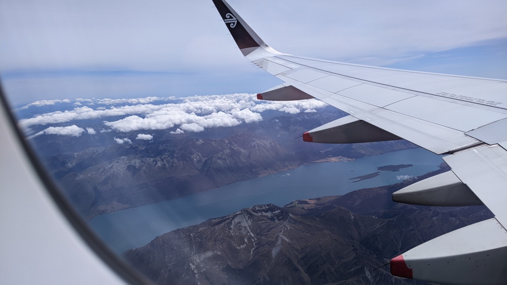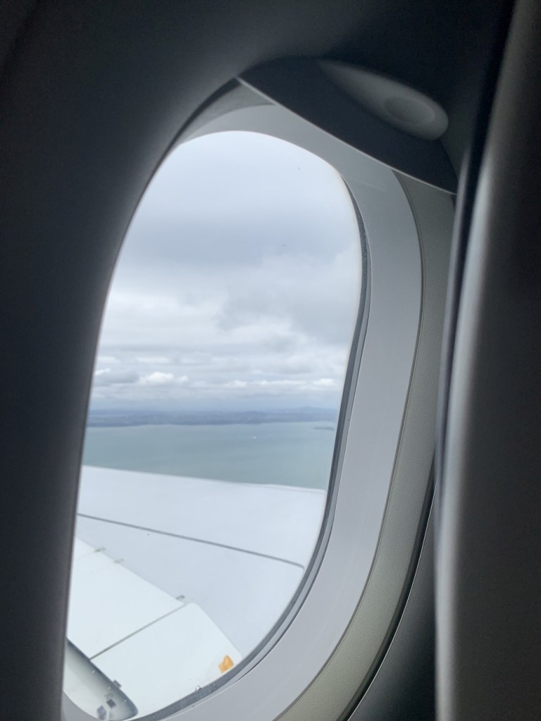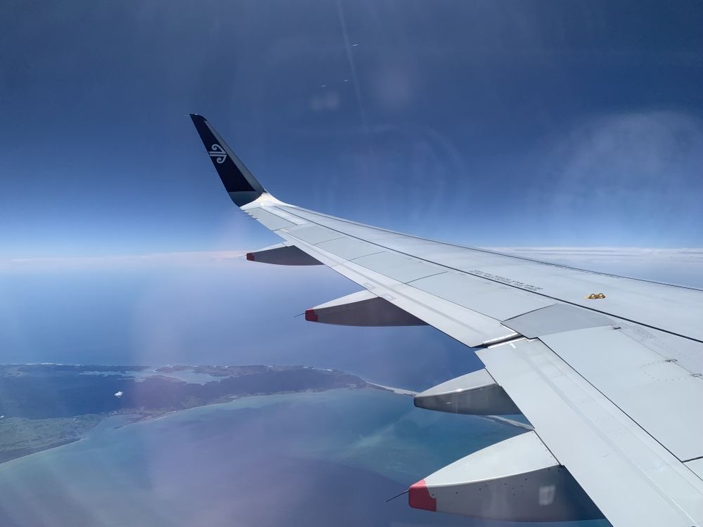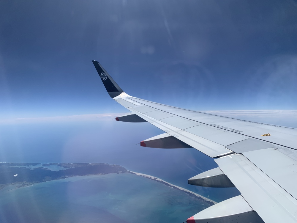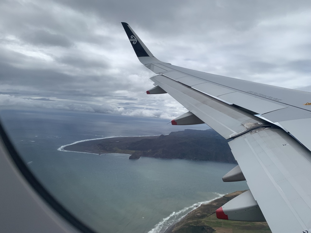 Skies that got thicker and thicker with cloud the further north we flew. We did manage to see Farewell Spit, and get the briefest of glimpses of Mount Taranaki’s peak poking through the clouds, but from then on, much of the ground was obscured. Not that I could see much from the middle seat, anyway.