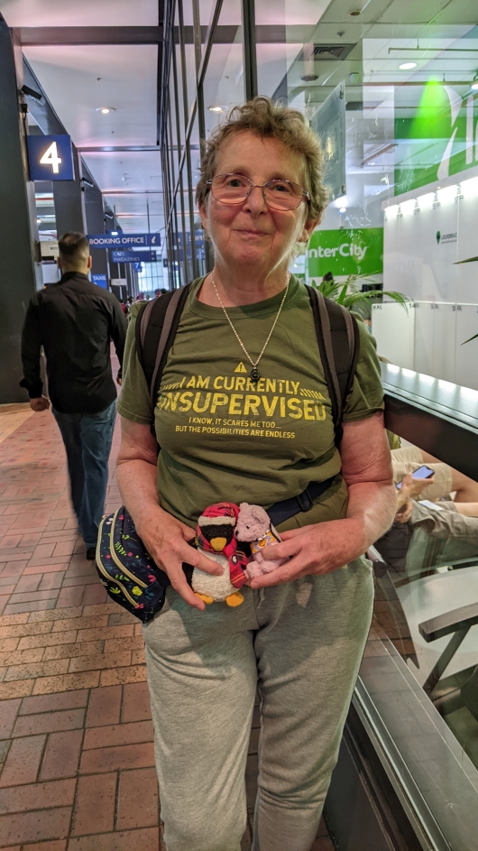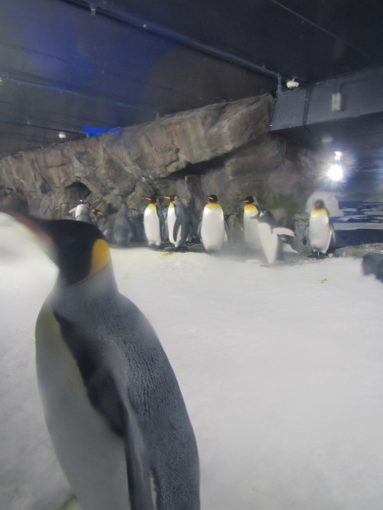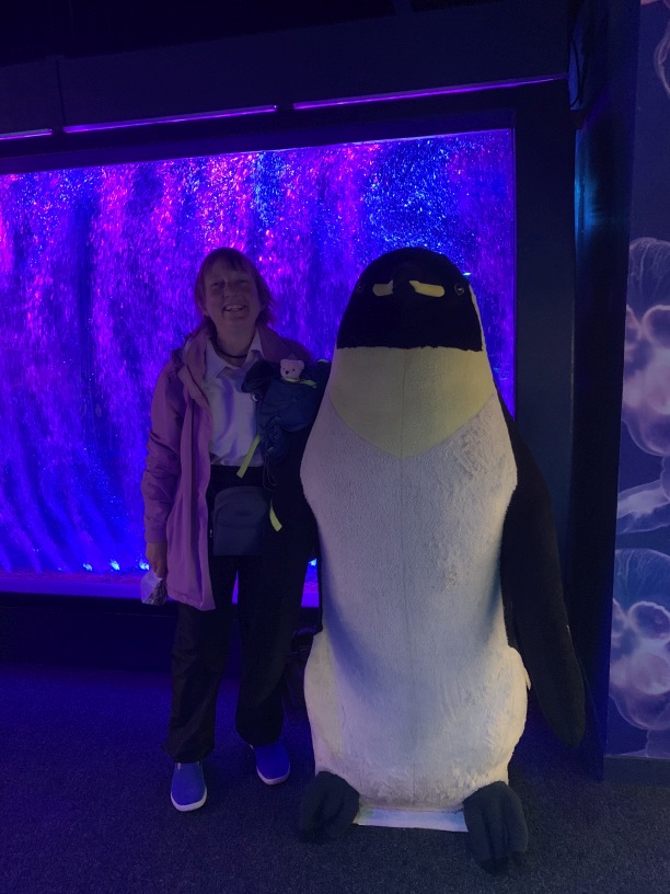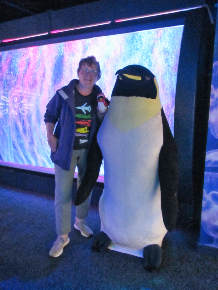 Two things we forgot. Me: my AA card (back at the hotel), which would have given me a 30% deduction to the entrance fee – and which I should have remembered because I didn’t have it last time. And Pen, her penguin T-Shirt. (She wore a Thunderbirds one for my benefit.)