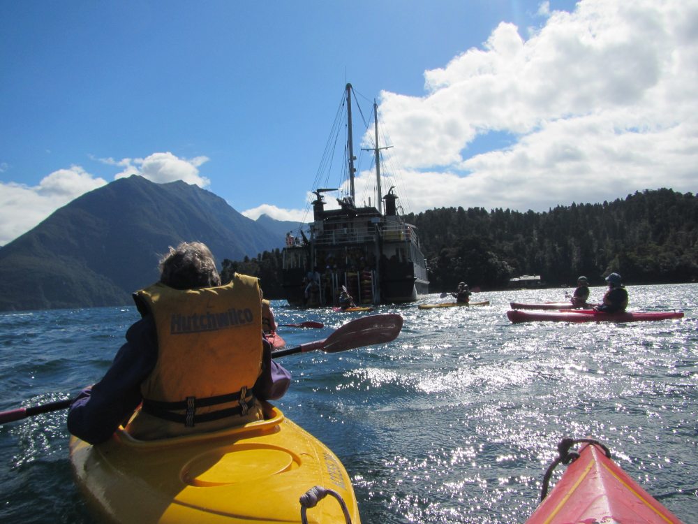 I’d take some photographs and then decide that I was NOT going to take anymore, because I didn’t want to risk losing my grip on the camera. And then I kept on seeing photographic scenes that I just had to take. Like the Wanderer at anchor in the lee of the mountains. So it was tuck my oar into my kayak so I wouldn’t lose it, unzip the pocket, haul the camera out (hoping I had a good grip on it), try not to get it too wet, take a photo as best as I could when the kayak was moving in the wrong direction and swinging around, click a few times, and then try to get the camera back into my pocket and zipped up without losing it or getting it wet.