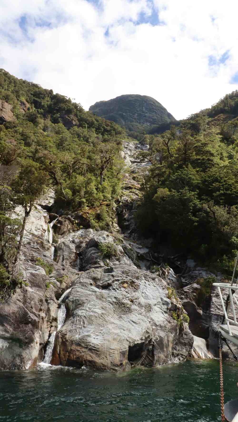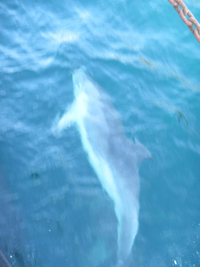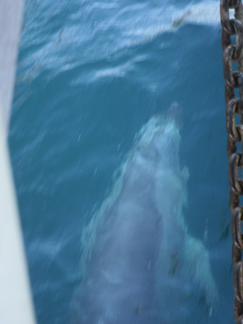 These were bottlenose dolphins, and the members of this pod were about a metre longer than most others because they needed extra warmth from the icy waters of the fiords. I had my DSLR camera with me, but it only had the wide angle lens on it (which pretty much lived on it for this entire voyage) and Pen had the only key to our cabin. She was jammed in at the bow of the Wanderer and I couldn’t get to her, nor could I ask her to leave her place, so I had to get what photos I could, through the boat’s infrastructure, using D.C.’s camera, which is small enough to fit in the leg pockets of my travelling cargo pants. So, they’re not great photos, but they are a record.