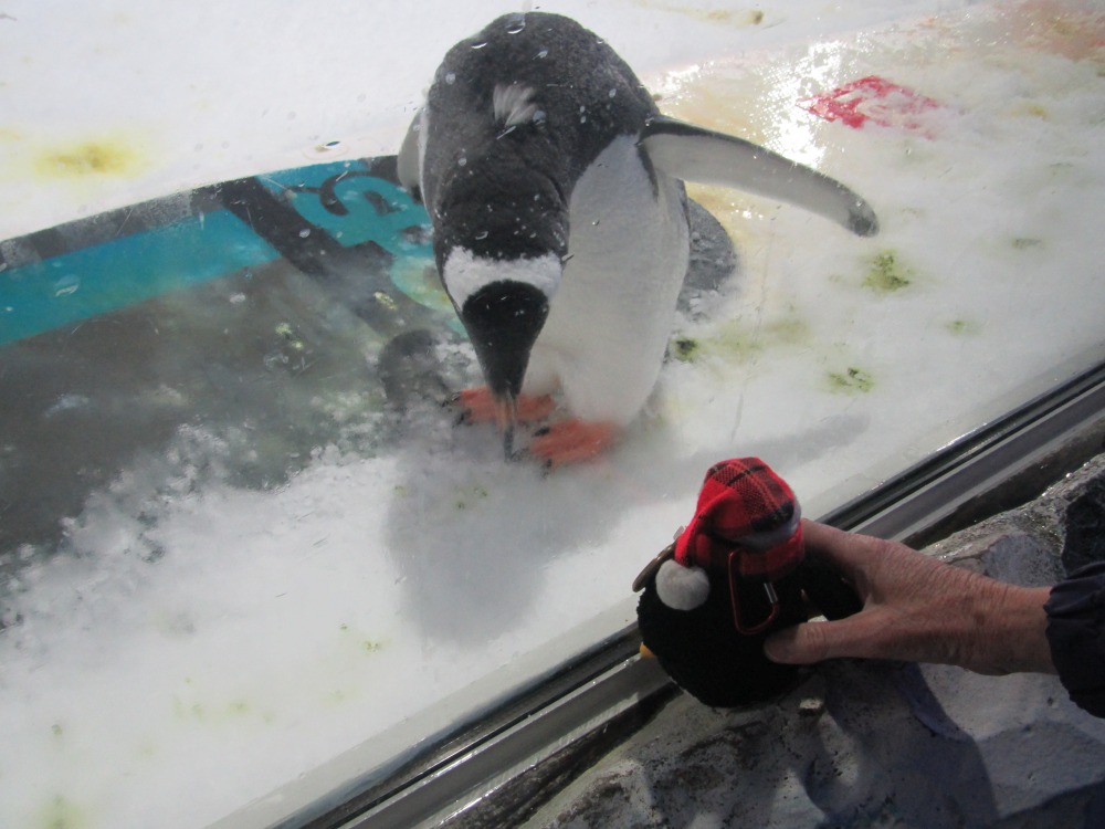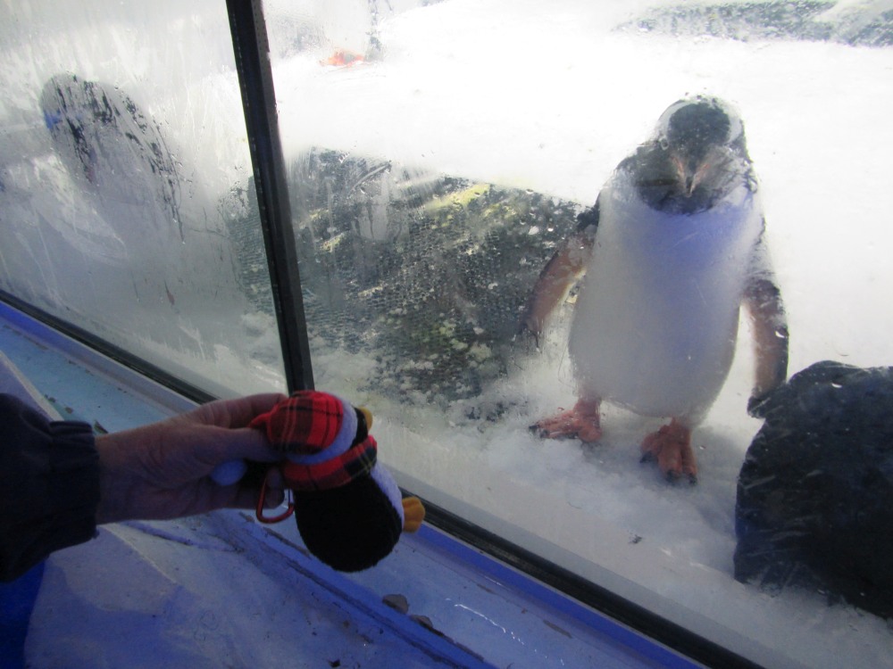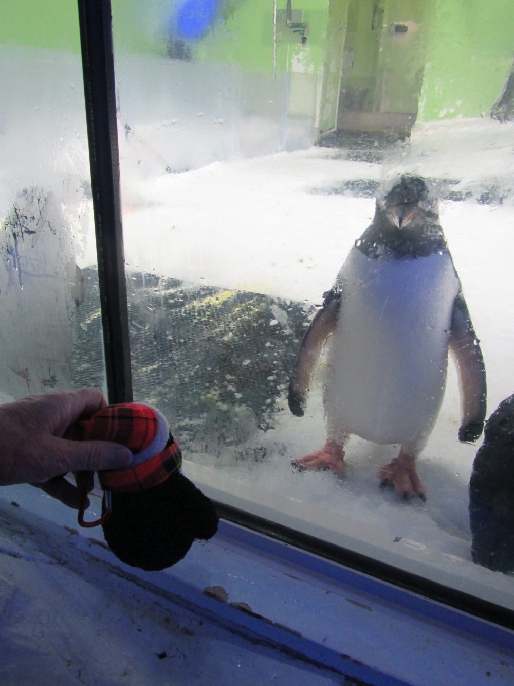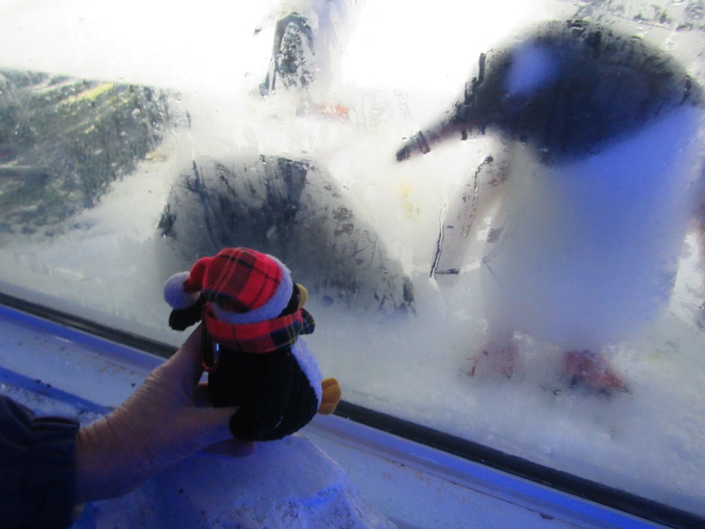 Pen got Scott (her Scott, not Robert Falcon) out of her bag and put him by the window to see the more active penguin’s reaction. One came over to check him out so quickly that he hit a surfboard that was in the ice and fell over. I didn’t see him do it, but did hear the bang.