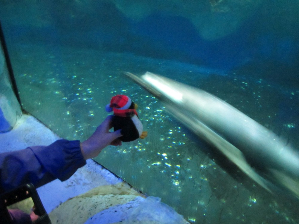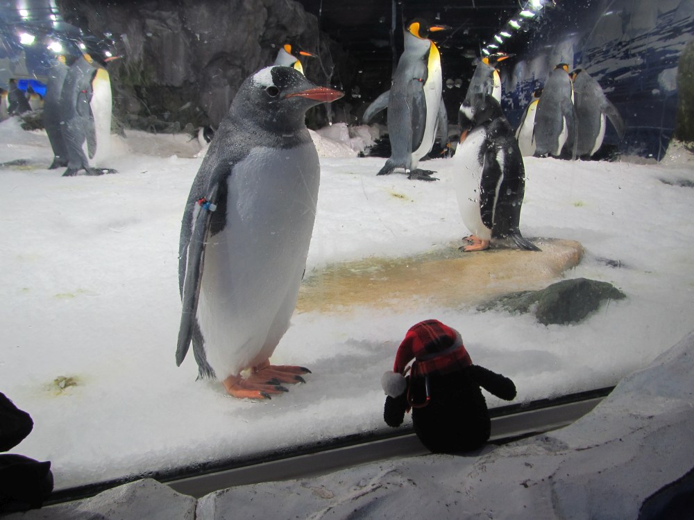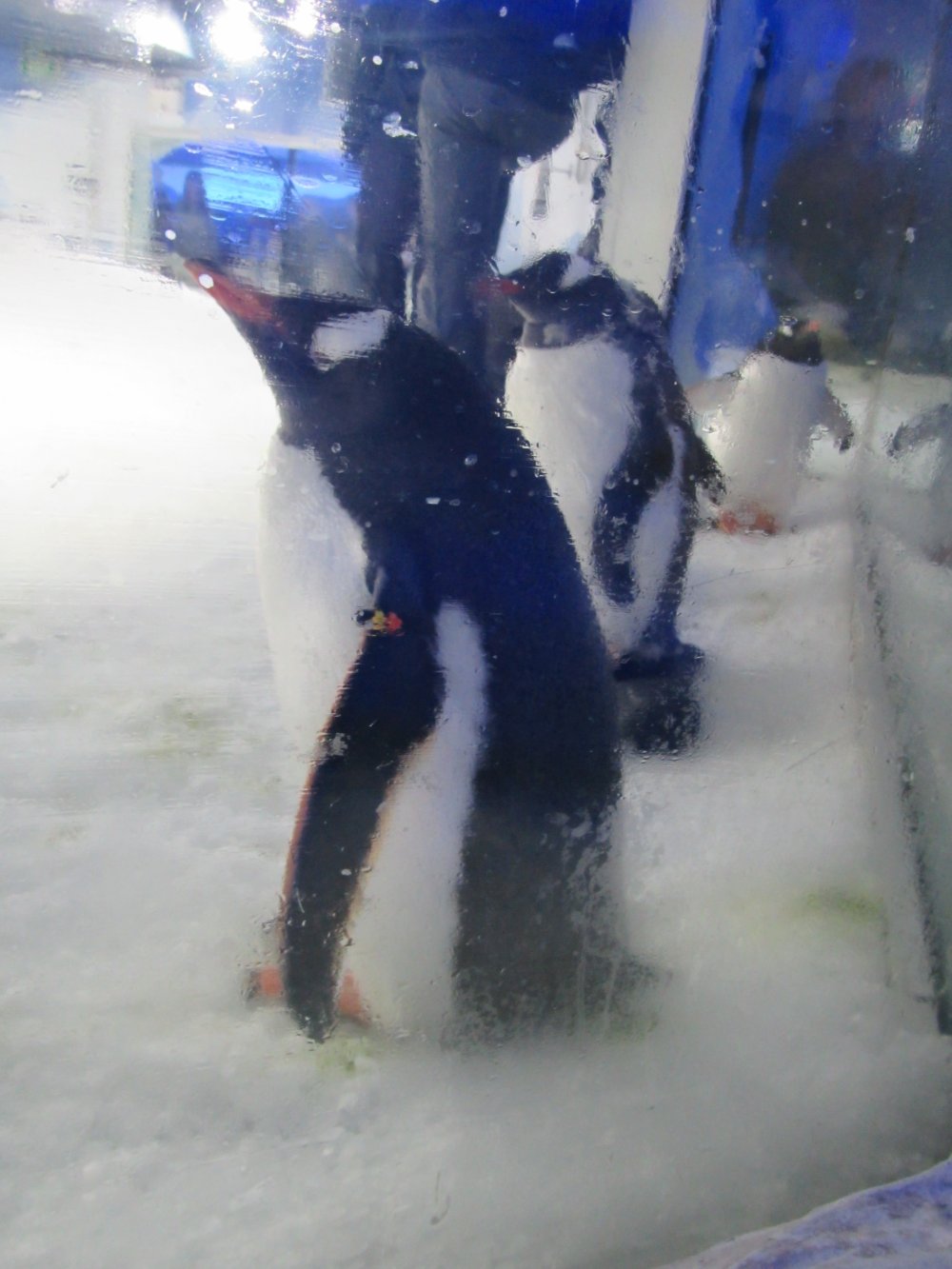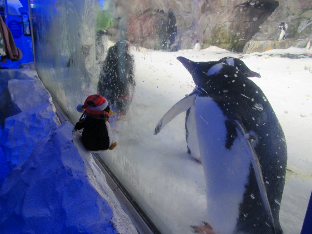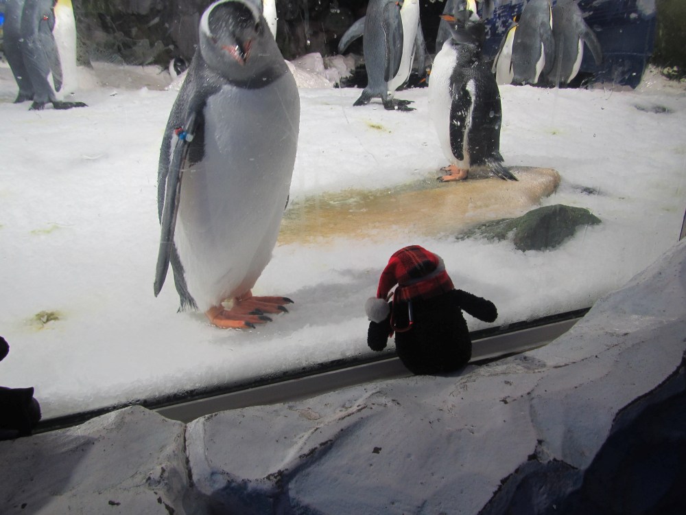 Pen got Scott (her Scott, not Robert Falcon) out of her bag and put him by the window to see the more active penguin’s reaction. One came over to check him out so quickly that he hit a surfboard that was in the ice and fell over. I didn’t see him do it, but did hear the bang.