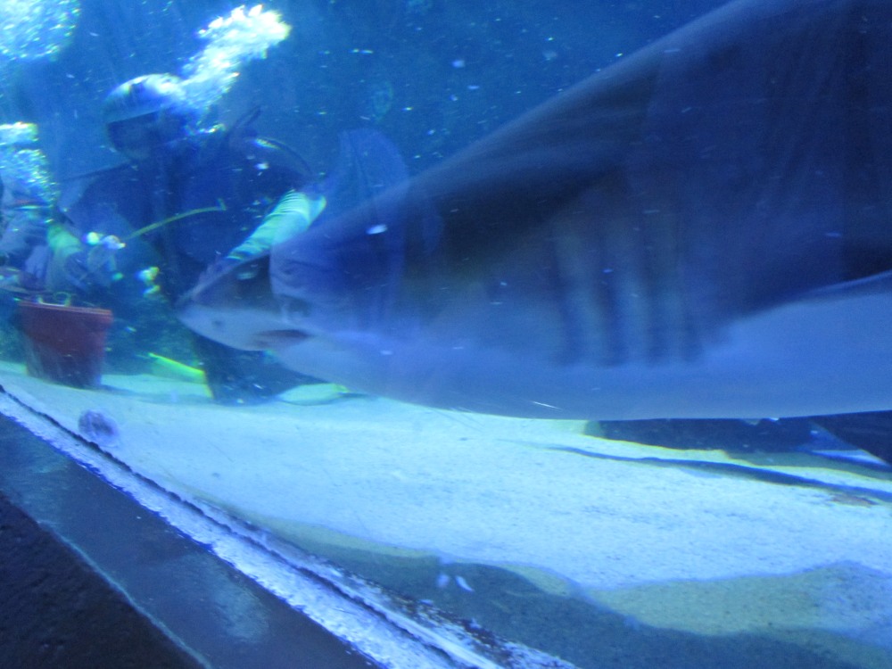 After that was the original tunnel aquarium and it was disappointing to see that the conveyor belt wasn’t working. But then we spied a woman with a microphone heading in the opposite direction, so we doubled back. She spoke about the type of fish on display and, when a couple of divers dove in and started feeding the sharks and stingrays, enlarged on this process.