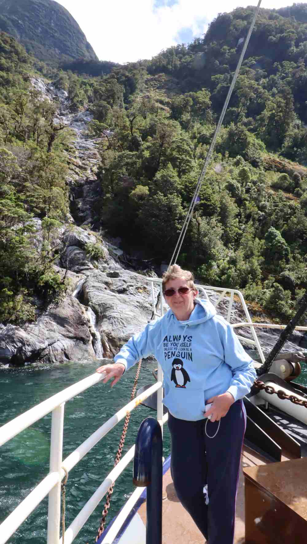 After we’d finally, happily, got back to the Wanderer, I went to get changed. I’d just got some dry clothes on when there was an announcement at 6.00pm that anyone who wanted to, could go for a swim in the Fiord. I wasn’t sure that I did want to, but, as I’d carted my swimming togs the length of the country, I decided it was time to find a use for them. So, I arranged with Pen that she’d get a photo of me in the water – not with her camera, which only takes good photos in certain lights, but with her phone, and got changed.
