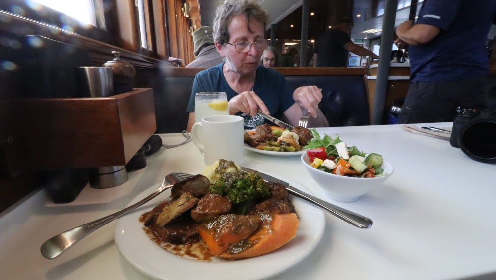 We shared our table with a couple of German men who were travelling together. One spoke good English, but the other evidently didn’t speak any. As it felt mean that he wasn’t really involved in our conversation, I was frantically trying to remember my fourth and fifth form German and failing as much as I had when I sat it for School Certificate. This was translated to the non-English speaker and then I got to try out some words on him. Like remembering how to count from one to ten, which he approved of. He (translated) said that he was looking forward to being rocked to sleep by the boat, and I said he needed some Brahms (Brahms Lullaby), which he seemed to get and find amusing.