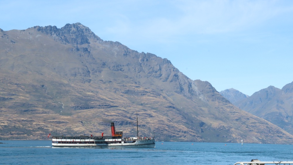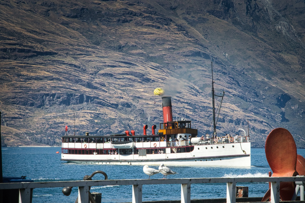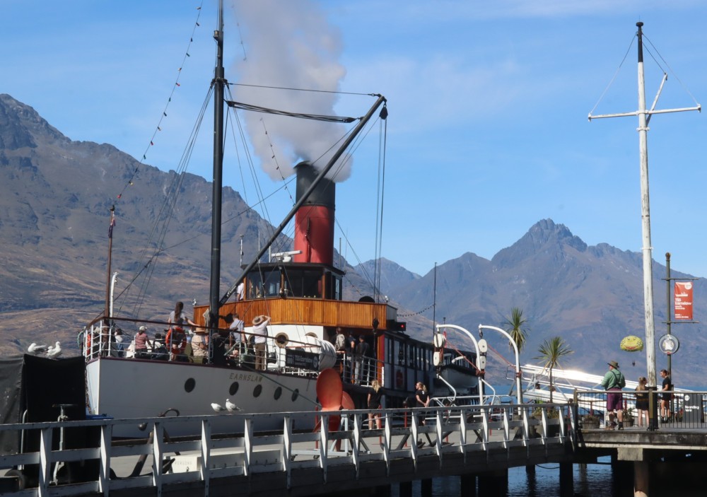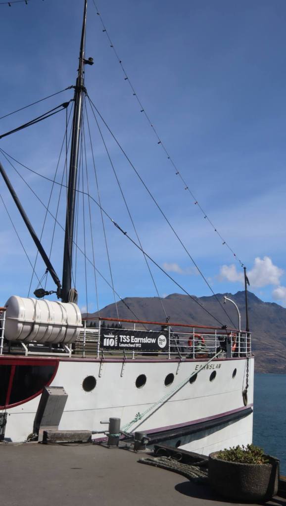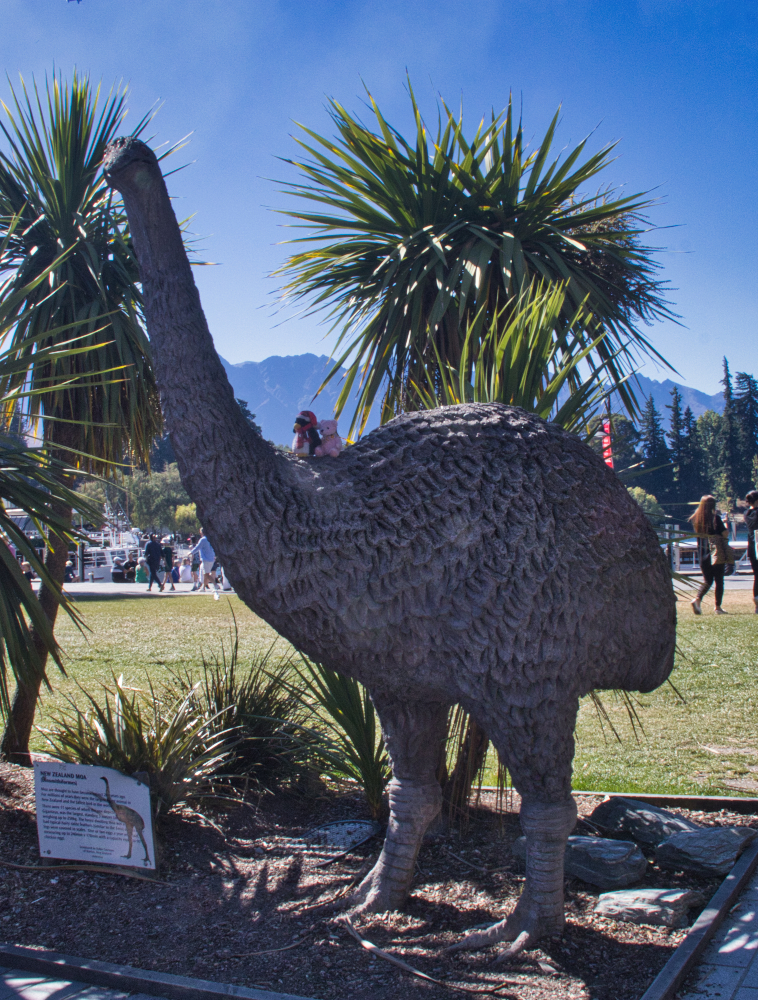 I don’t know that we relaxed. There was a bloke singing with his dog howling in accompaniment. The TSS Earnslaw was just getting read to set sail, so we had to get photos of that. There’s a concrete/plaster moa and we had to get photos of it with Kally and Scott, and then a couple came along and offered to take photos with us in it as well.