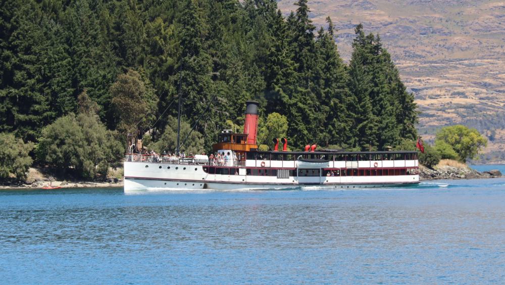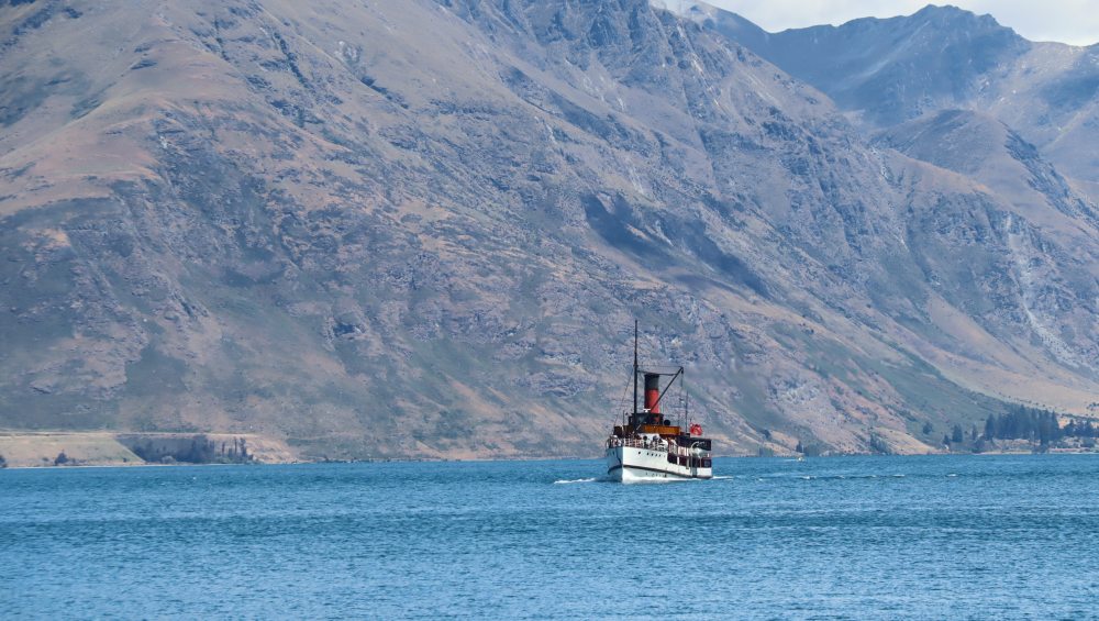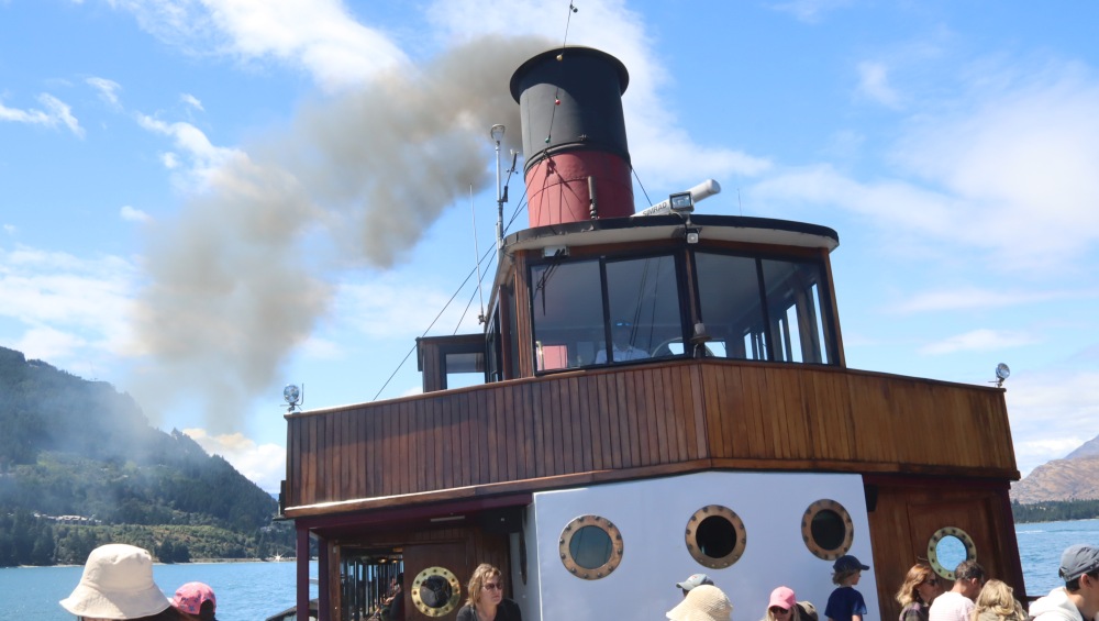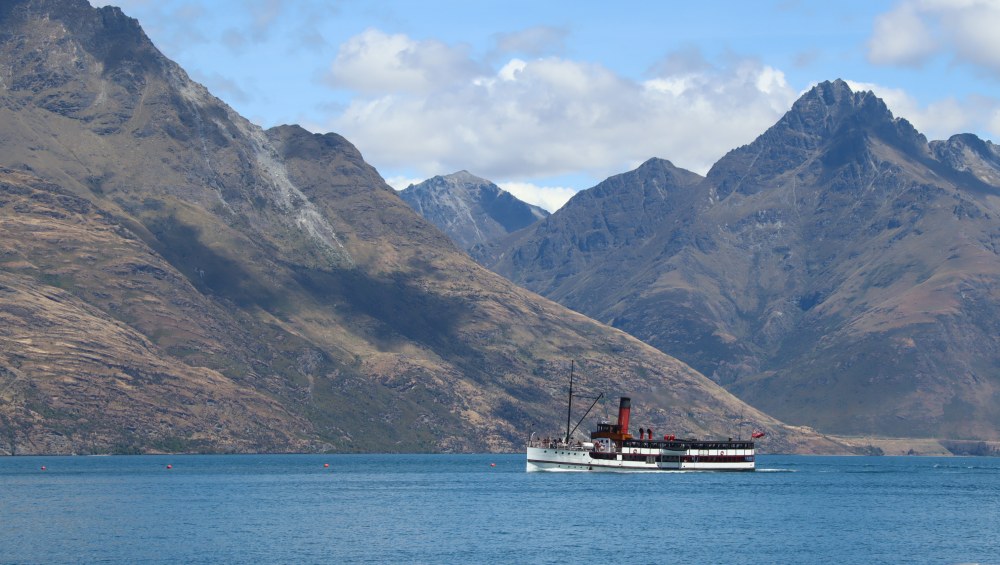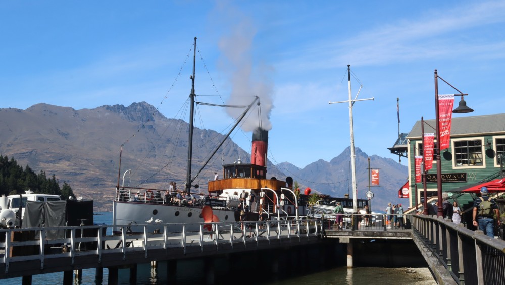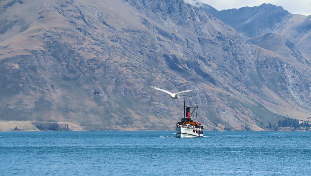 I don’t know that we relaxed. There was a bloke singing with his dog howling in accompaniment. The TSS Earnslaw was just getting read to set sail, so we had to get photos of that. There’s a concrete/plaster moa and we had to get photos of it with Kally and Scott, and then a couple came along and offered to take photos with us in it as well.