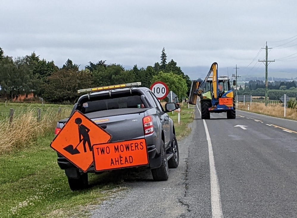 We watched with some interest, as they mowed with a tractor further down from us, and as another tractor unit with an extendable mowing arm negotiated the road markers on the other side of the road. Then they trundled past the café to the corner, did a U-Turn, lowered the mowing arm, and started coming for us.