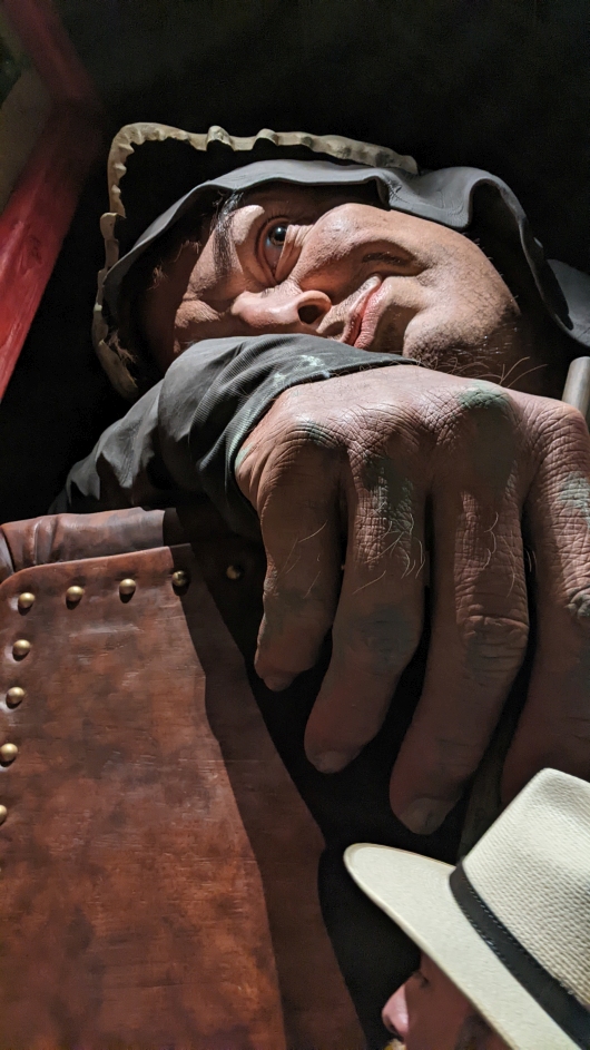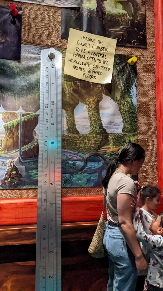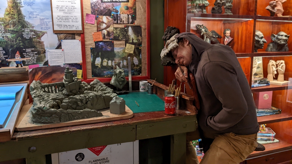 Next was the (in my opinion), much nicer “fantasy” synopsis. This included a model of one of the Wētā Workshop sculptors, who’d “fallen asleep” at his desk when working on a plasticine model for this “film.” Step into the next room and you’ve stepped into an eight times larger scale version of him and his desk.
