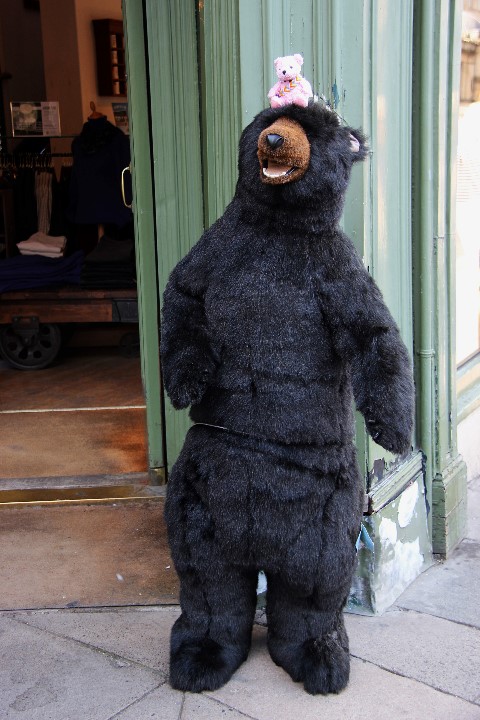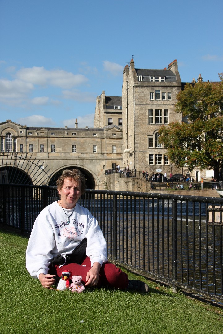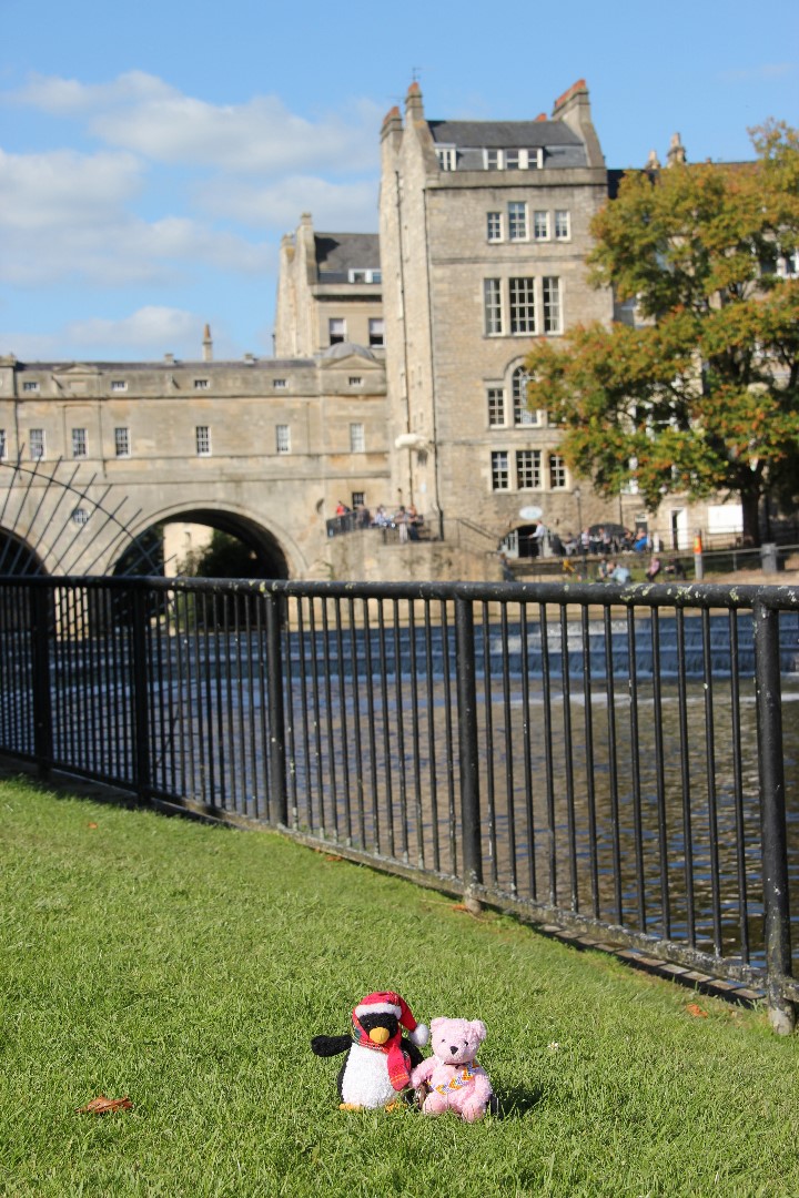 Our plan, after yesterday’s wanderings, was to get a sandwich from a cheesemonger’s that we’d found. (One of the nice things of Bath is that there are so many “boutique” shops and so few chain stores. Strangely they remain open until 5.30 on Sundays.) We found the store, only to be told that they don’t do sandwiches on Sundays. So we headed back to Poultney Bridge and I bought a Cornish pasty for lunch. We sat on the lawn, close to the weir, to have our lunch and the obligatory bear/penguin shots.