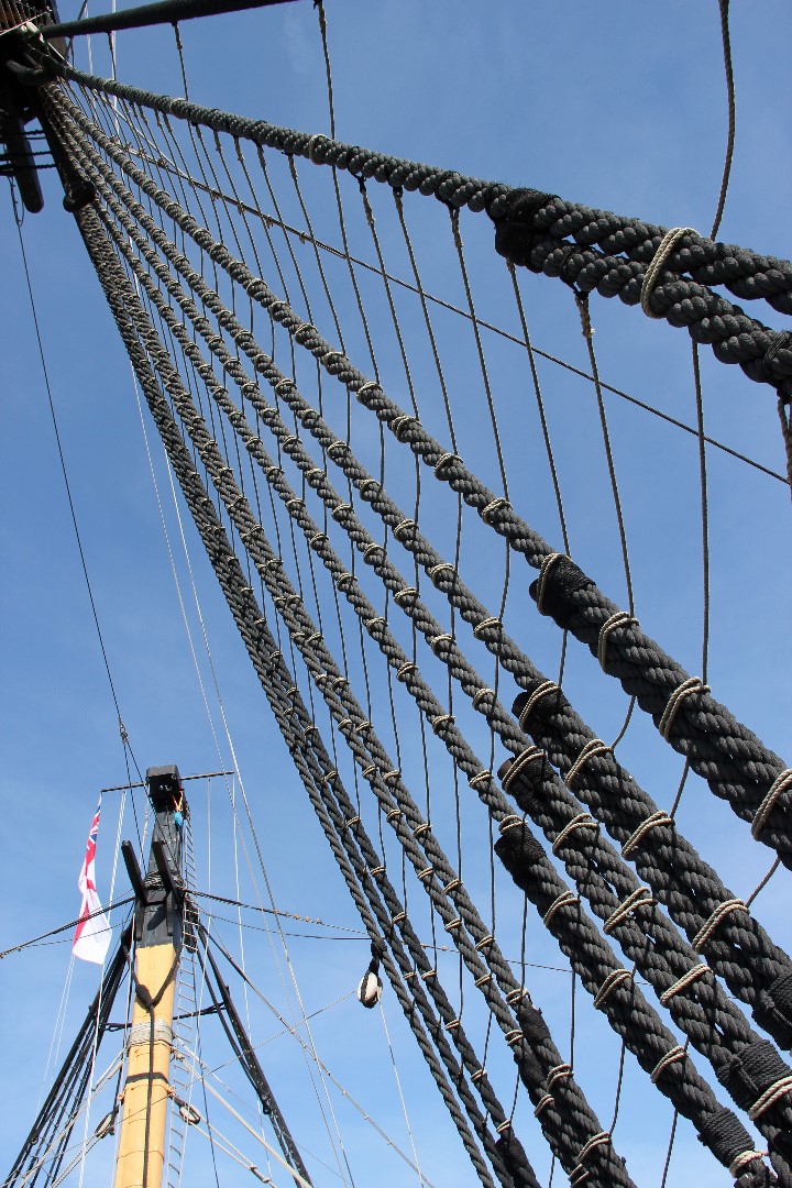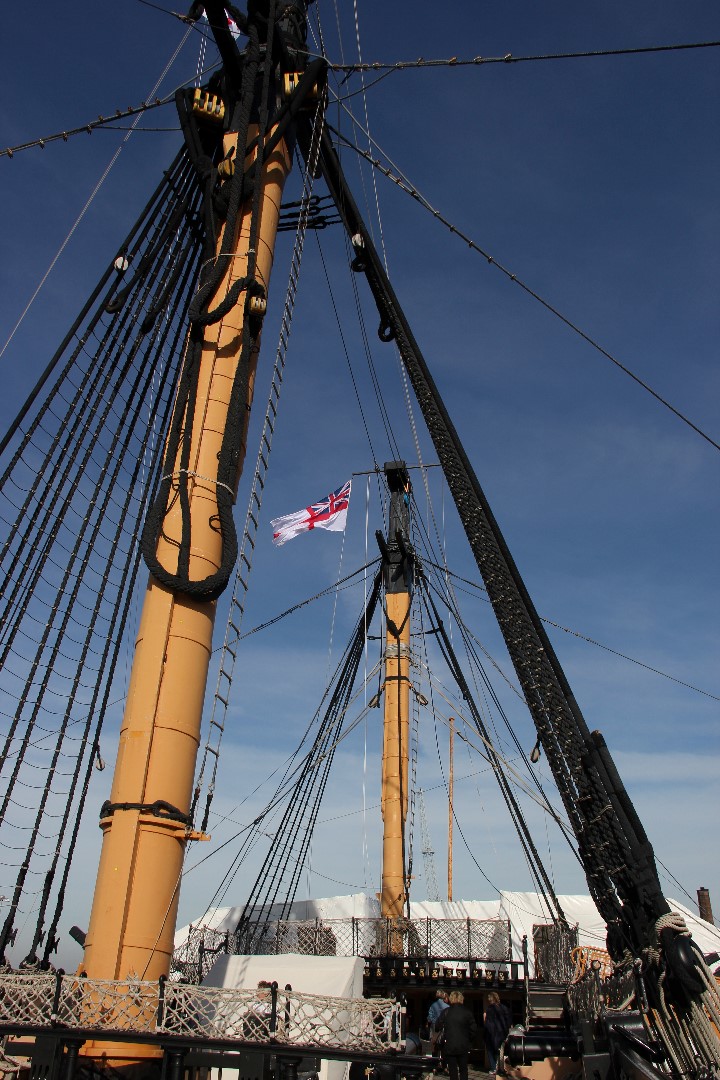 The Victory is right next to the building that houses the Mary Rose. When the Victory was put into port for posterity they rammed her middle mast into ground so she’s pinned there, in Pen’s words, “like a butterfly”. The masts she has now are from an 18th century sailing ship and have been removed for the restoration that is currently being done to it. When the masts are replaced they will be lightweight replicas so that they won’t have to be removed again for future restorations. Remember that her entire weight is resting on her keel, so they want to take off as much weight as possible.