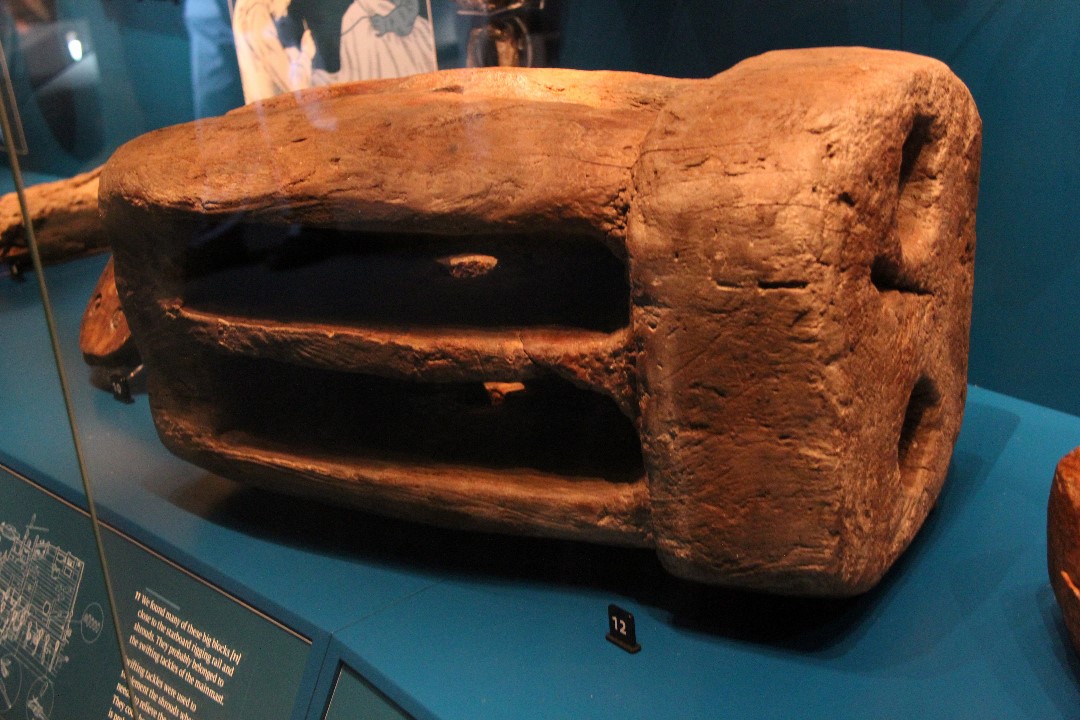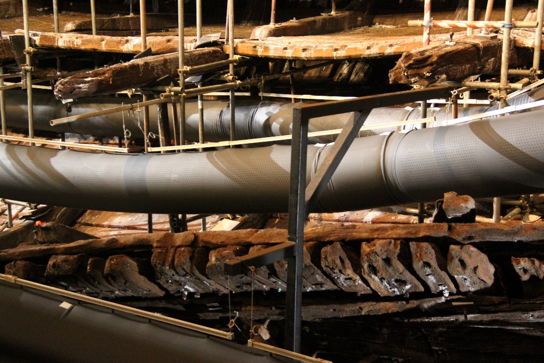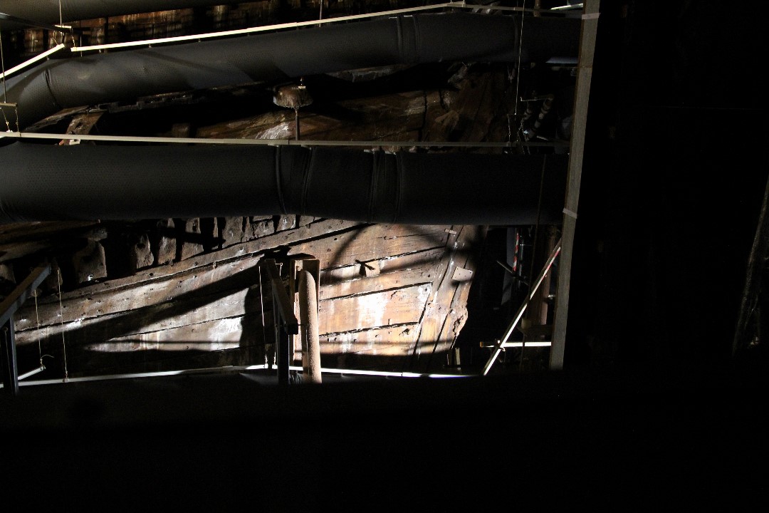 The Mary Rose was rediscovered in 1982, excavated, brought to the surface, and taken to her final home. Then she was continuously sprayed with clean water to ensure that her timbers didn’t shrink (which could have been as much as 20-50%). Once the next stage was readied she was sprayed with polyethylene glycol to replace the water and keep the timbers’ cells intact. At the stage where we saw her, she had huge black tubes around her, drying out the PEG. Once that’s finished she should be stable enough for the final stage of her display.