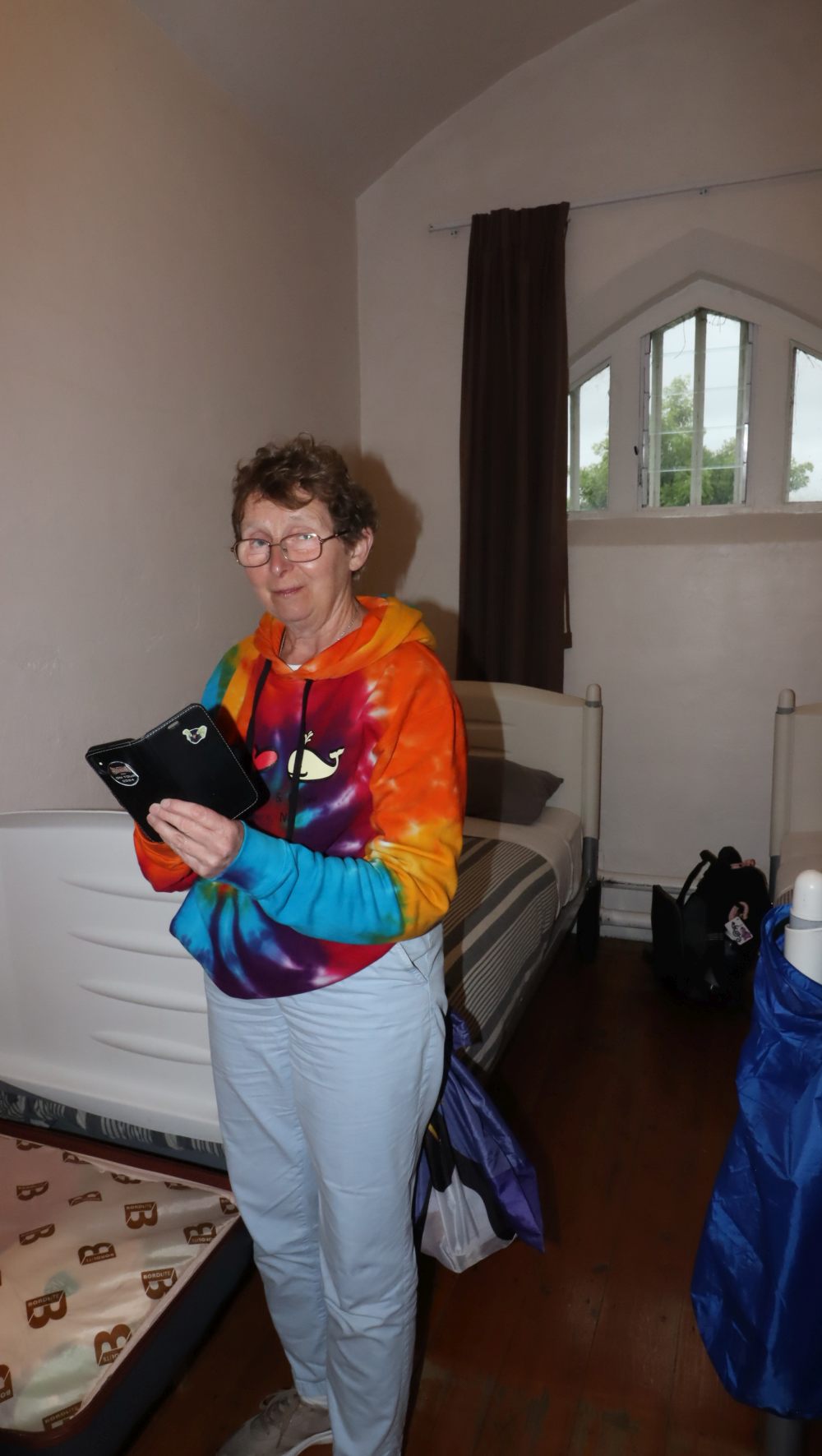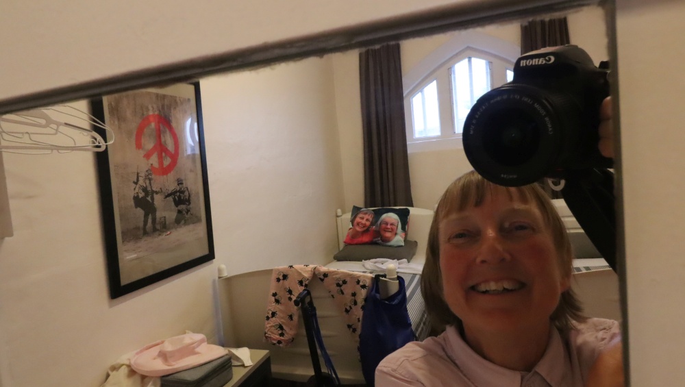 But we got there to be greeted by a sign saying don’t let the cat in and a cat sitting by the door. We were assigned to room 18, which was upstairs, and the guy on the desk carried Pen’s case up for her. I decided I was going to assert my independence and carried my own bag myself. (With Pen carrying my pillow.) It’s more awkward than heavy. Even with two Kaikōura stones in it.