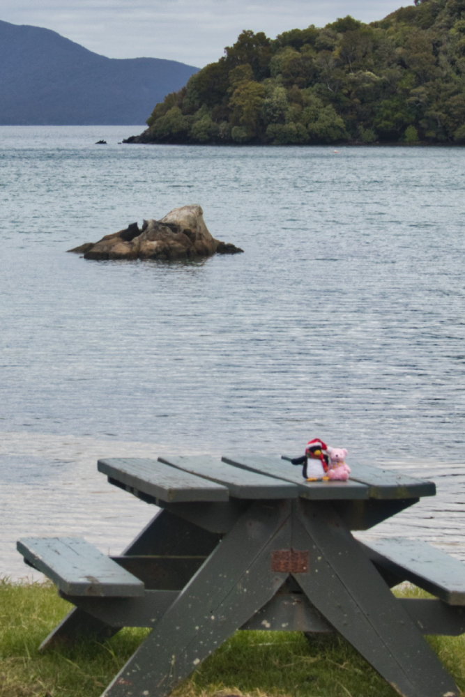 Once we’d had our lunch and a bit of a rest, we were ready to move on, and did so by taking the loop track to Deep Bay (they have original names down here) and then back. When we got to Deep Bay, we celebrated by me breaking my muffin in half and giving it to Pen.