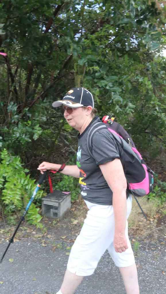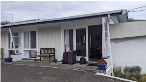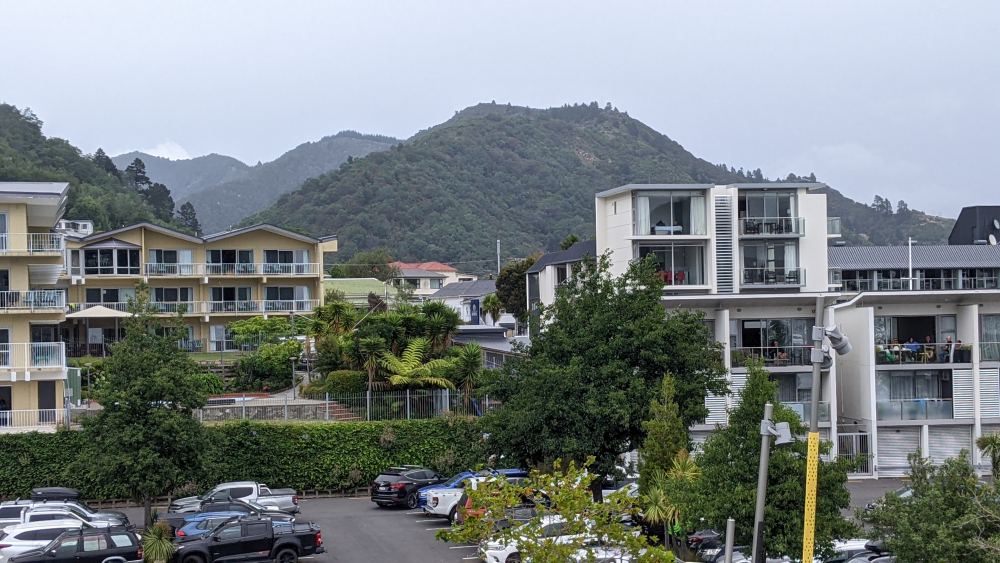But we got there to be greeted by a sign saying don’t let the cat in and a cat sitting by the door. We were assigned to room 18, which was upstairs, and the guy on the desk carried Pen’s case up for her. I decided I was going to assert my independence and carried my own bag myself. (With Pen carrying my pillow.) It’s more awkward than heavy. Even with two Kaikōura stones in it.