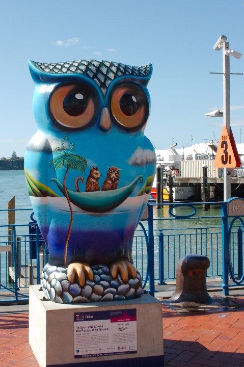 To the Land Where the Ponga Tree Grows: inspired by the famous Owl and the Pussycat poem by Edward Lear. By depicting the Owl and the Pussycat in the boat this design is focussed on the journeys that are part of life both internally and/or physically. The land and the sea are painted with a strong and obvious influence and celebration of the beauty of New Zealand colours and landscape, seas and skies. The use of gold has layered suggestions from the artist about what we can contribute, and also the value of compassion and charity as part of society. The ponga tree is a central and strong element, yet with its own twists and turns. The stones are indicative of being grounded and focussed, and again a nod of antipodean respect to rivers and coastlines of this wonderful country and landscape.